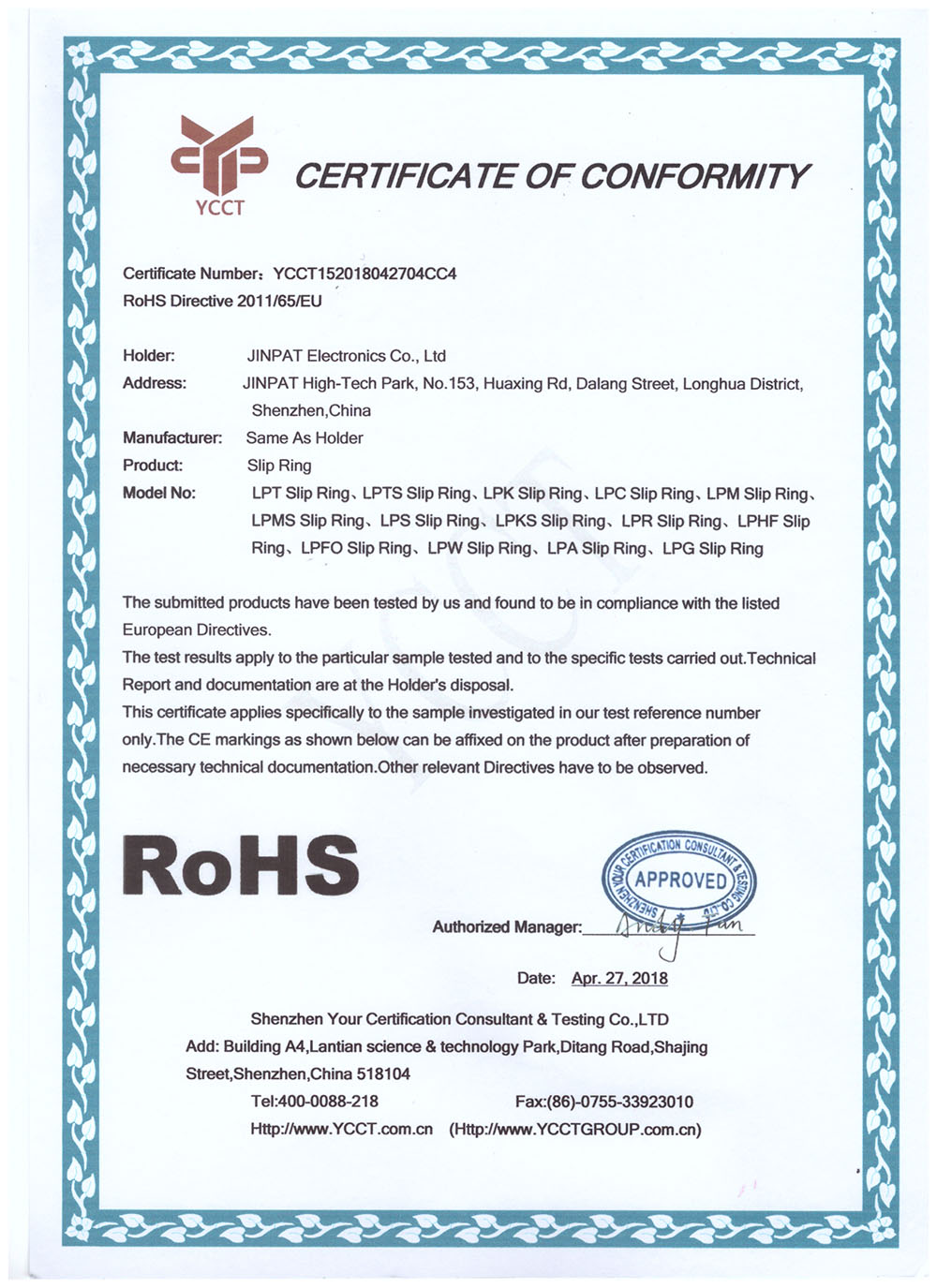 晶沛通過(guò)了歐盟CE認(rèn)證、FCC認(rèn)證、SGS認(rèn)證、BV“船級(jí)社”認(rèn)證、防爆認(rèn)證等多項(xiàng)認(rèn)證,生產(chǎn)的導(dǎo)電滑環(huán)都符合RoHS環(huán)保要求,先后被授予“國(guó)家高新技術(shù)企業(yè)”稱(chēng)號(hào),目前已獲得45項(xiàng)專(zhuān)利,其中發(fā)明專(zhuān)利6項(xiàng)。